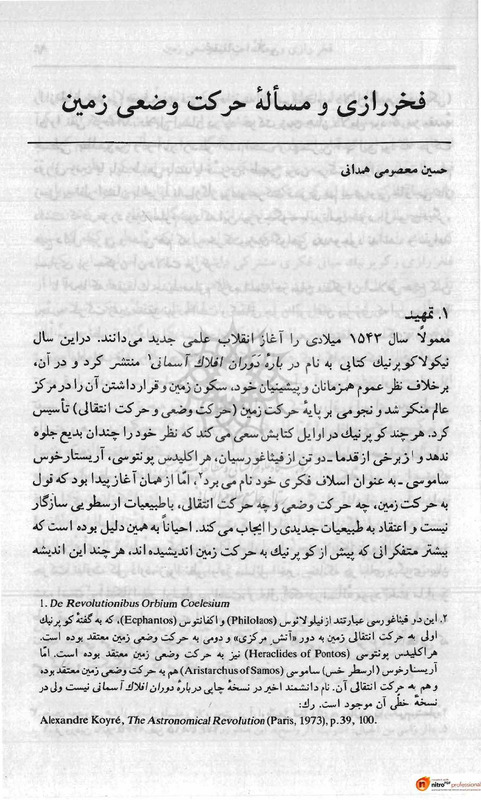 File #33: "معصومیهمدانی - 1365 - فخر رازی و مسأله حرکت وضعی زمین.pdf"